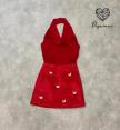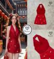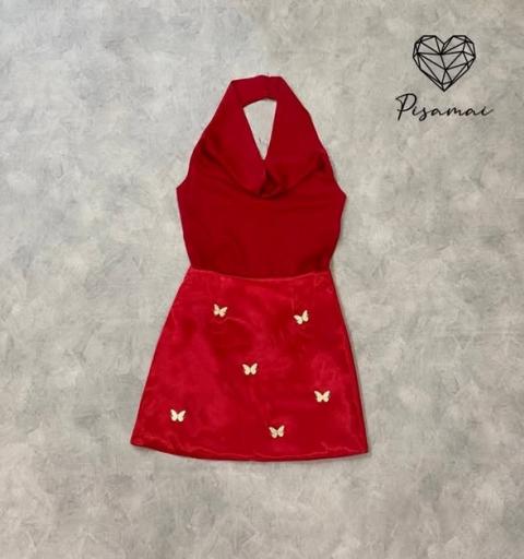 เซ็ตเสื้อคล้องคอผ้ามันคอถ่วงสีแดงมาคู่กับกระโปรงสอบตัวสั้นปักผีเสื้อสีทองอร่าม