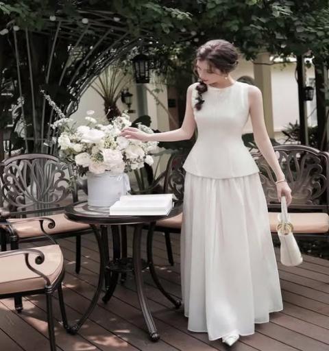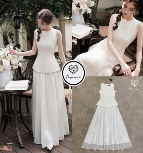 เซ็ตเสื้อแขนกุดสีขาว มาคู่กับกระโปรงสีขาวฟู แพทเทิ้นสวยมากกกกกกก