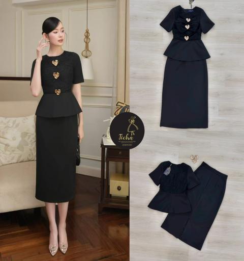 👗👗Detail : Set2ชิ้น สีดำทั้งชุด เสื้อแขนสั้นคอกลม แต่งผ้าลูกไม้จับจีบเป็นโบช่วงอก ชายเสื้อบานออกเล็กน้อย ( อกและไหล่เสริมฟองน้ำ ซิปหลัง ) มาพร้อมเข็มกลัดสีทองเพิ่มTexture ของชุด แมตช์กับกระโปรงยาวทรงสอบ แต่งผ้าหลัง (มีซิปหลัง) เย็บซับในอย่างดี ทรงสวยเรียบหรูดูแพง บอกเลยว่ารุ่นนี้สวยมาก❤️