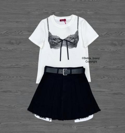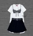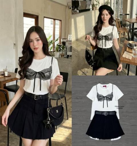 เซต 3 ชิ้น ขาว+ดำ เสื้อคอกลมสีขาวแขนสั้นทรงตรงพิมพ์ลายเสื้อในสีดำผูกโบว์