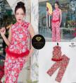 เซ็ต 2 ชิ้น เสื้อคอจีนแขนกุดสีแดง พิมพ์ลายดอกไม้ ชายเสื้อแต่งขนนกแท้