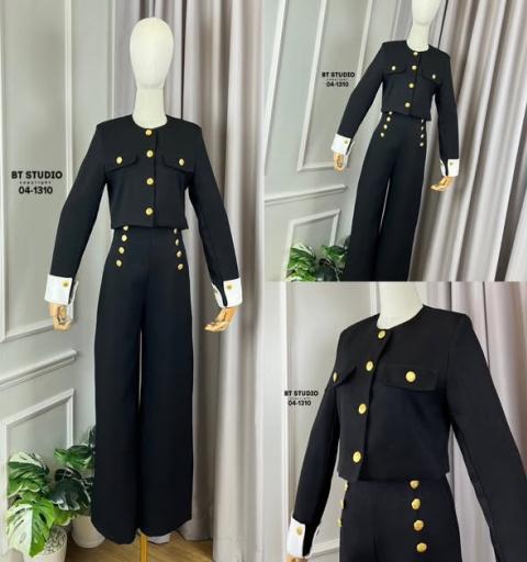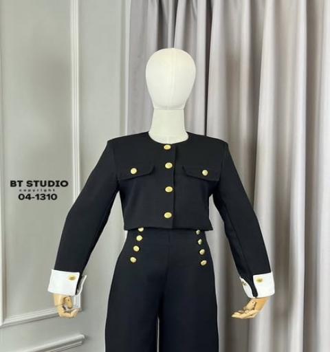 เซท 2 ชิ้น เสื้อเบเซอร์แขนยาวคลุมด้านหน้าแต่งกระเป๋าหลอกกระดุมสีทองปั้มลาย