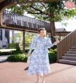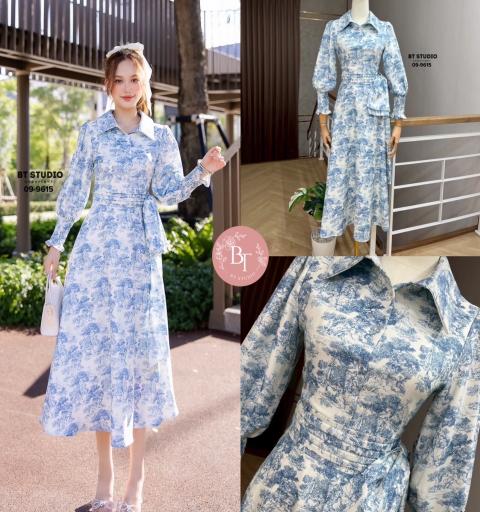 เดรสยาวคลุมเข่าคอปกกระดุมหน้าแต่งแขนยาวปลายแขนสม็อค