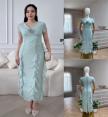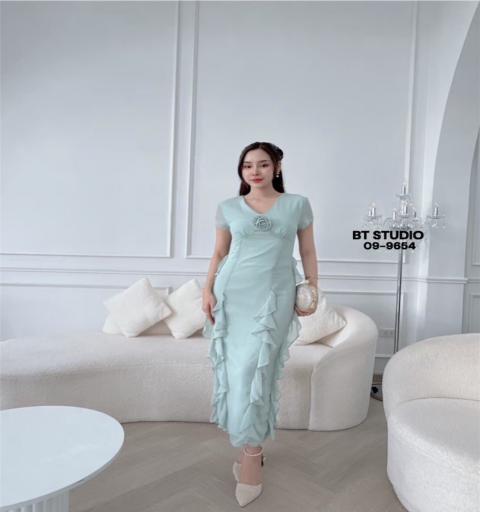DETAIL :ชุดเซท 2 ชิ้น เดรสยาวแขนสั้นคอวี จับจีบช่วงอกเล็กน้อย มีระบายหน้าหลังและด้านข้าง ผ่าหลัง มาพร้อมเข็มกลัดดอกไม้ มีซิปหลัง งานซับในทั้งตัว