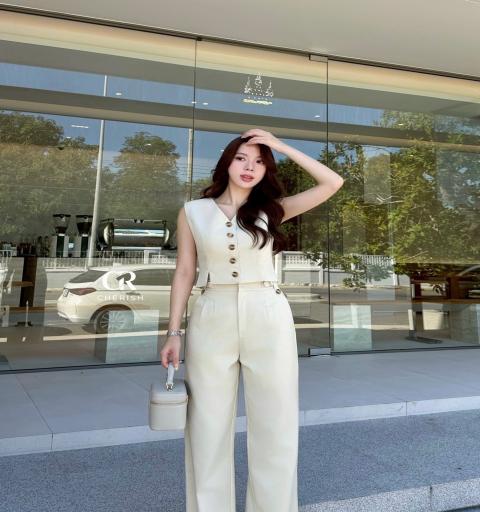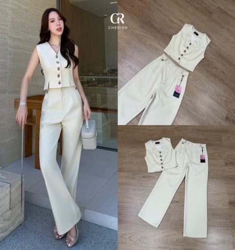 ชุดเซ็ท เสื้อกางเกง ตัวเสื้อคอวีเป็นเสื้อกั๊กแขนกุดแบบครอปทรงเข้ารูป