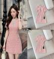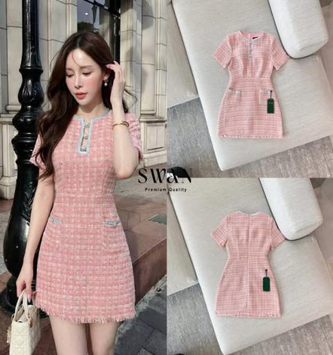 เดรสทรงเข้ารูปผ้าทวีตโทนชมพูหวาน แทรกด้ายสีขาวเพิ่มมิติ