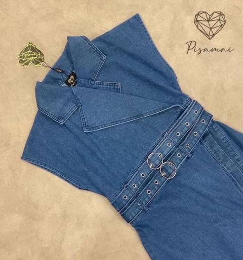 เดรสยาวแขนกุดผ้ายีนส์ทรงสวยดีไซน์คอวีแต่งกระดุมด้านหน้าเพิ่มความเก๋
