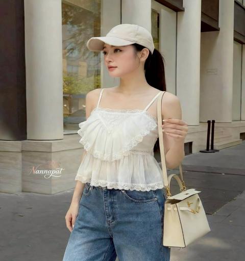 เสื้อสายเดี่ยวสีขาวออฟไวท์ โดดเด่นด้วยงานระบายชั้น (Layered Ruffles)