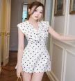 จั้มสูทขาสั้น แขนกุด คอปกพับ อกเย็บโบว์ เนื้อผ้าพิมพ์ลายจุด