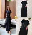 เดรสตัวยาว แขนสั้น เอวเย็บแต่งดอกไม้ ซิปหลัง ผ้าเรียบ สีพื้น