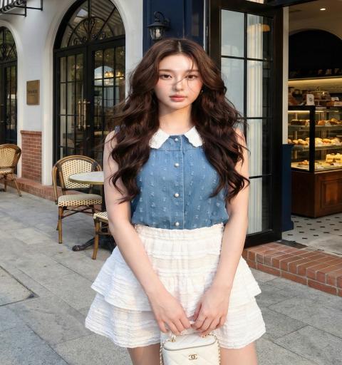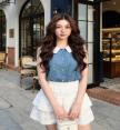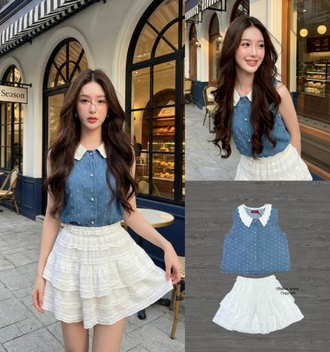 เซตเสื้อยีนส์+กระโปรงขาว มาด้วยกัน 2 ชิ้น เสื้อยีนส์ทรงตรง คอปกผ้าลูกไม้ขาว แขนกุด