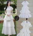 เดรสยาวสีขาว คอปกแขนสั้น แต่งอ่ะไหล่กระดุมมุข ใช้งานได้จริง