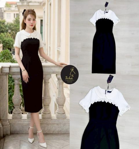 เดรสยาวคอบัวแขนสั้น ดีไซน์แต่งสีทูโทนขาวดำ