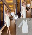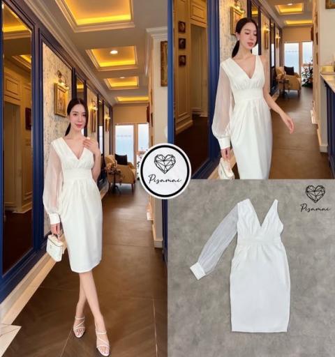 เดรสคอวีสีขาวทรงแขนกุด อีกด้านแต่งแขนยาวซีทรูผ่าทรงสอบ 5 ส่วน