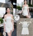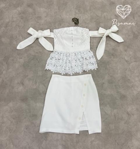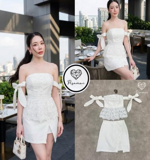 เดรสเกาะอกสีขาวแขนโบว์งานลูกไม้ฉลุ มาคู่กับกระโปรงสอบตัวสั้นสีขาว