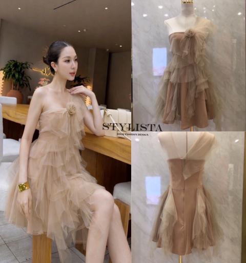 มินิเดรส แต่งผ้าซีทรูริ้วๆ ชั้นๆ คลุมไหล่ มีดอกไม้ตรงช่วงอก