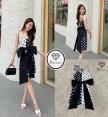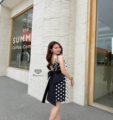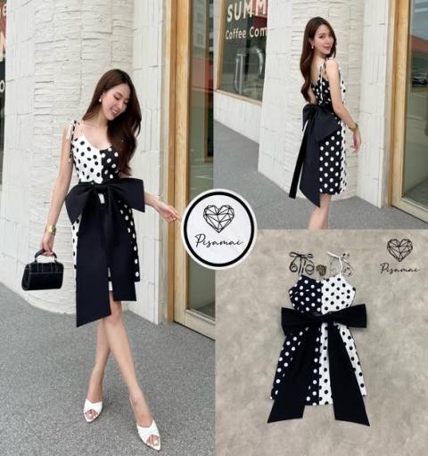 เดรสสายเดี่ยวทูโทนขาวดำลายจุดมาพร้อมกับโบว์เข็มขัดใหญ่แยกชิ้น