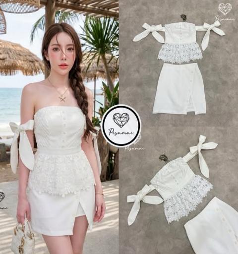 เดรสเกาะอกสีขาวแขนโบว์งานลูกไม้ฉลุ มาคู่กับกระโปรงสอบตัวสั้นสีขาว