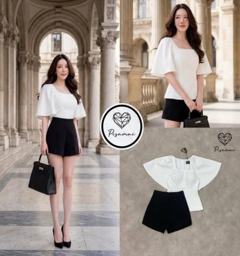 เซ็ตเสื้อแขนค้างคาวสีขาว มาคู่กับกางเกงขาสั้นสีดำ รุ่นนี้ผ้าดีใส่สวย