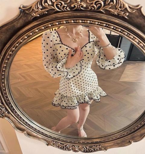 Detail >> Dress เดรสแขนยาว คอเหลี่ยม อกโบว์ ตัวเดรสแต่งขอบด้วยลูกไม้สีดำ ชายเดรสเย็บระบายเป็นชั้นๆ ซิปหลัง เนื้อผ้าพิมพ์ลายจุด งานคัตติ้งเนี๊ยบ ทรงเป๊ะ ผ้าอย่างดี ใส่สบาย ชุดนี้งานสวยมากค่ะ #เดรสสาวเกาหลี #เดรสสาวแกรม #เดรสluxury #ชุดแบรนด์Widelia@real
