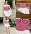 เดรสเกาะอกลายสก็อตสีแดง ดีเทลด้านล่างตัดแต่งผ้าลูกไม้ฉลุสีขาวสวยเก๋