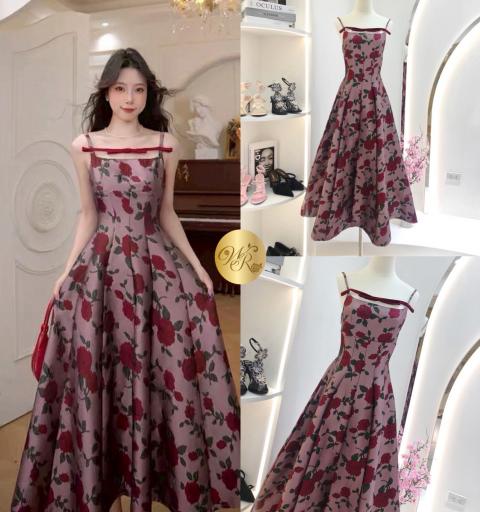 Dress ยาวตัวสวยทรงดี ตัวเดรสเลือกใช้ผ้าทอเนื้อสวยลายดอกกุหลาบสีสวยโดดเด่น