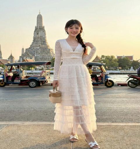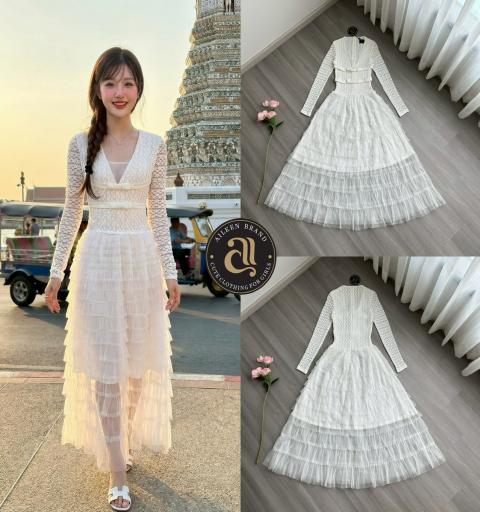 👗Maxi เดรสแขนยาว คอวี ดีเทลช่วงครื่งตัวบนเป็นเนื้อผ้าลูกไม้ แต่งสายโบว์คู่หน้าเหย็บติดมากับชุด ตัวกระโปรงแต่งระบายด้วยผ้ามุ้งตะข่ายเป็นชั้นๆ ทั้งตัว มาพร้อมชับในสั้น ซิปหลังช่อนอย่างดี งานสวยเนื้อผ้าดี คัตติ๊งเป๊ะ ห้ามพลาดน่า