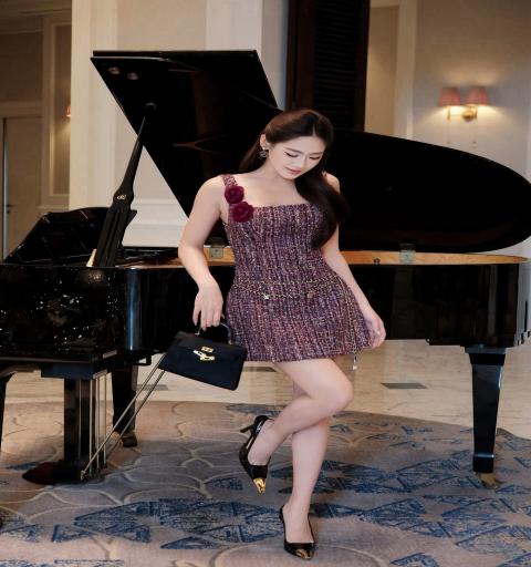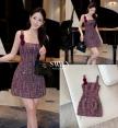 เดรสผ้าทวิตโทนไวน์ดีไซน์เข้ารูป มาพร้อมดีเทลสายเดี่ยวแต่งดอกไม้เข็มกลัดเพิ่มความโรแมนติก