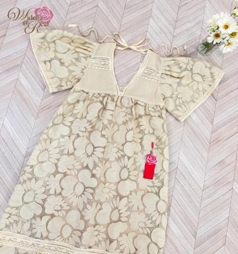 แม็กซี่เดรสทรงปล่อย ตัวยาว คอวี แขนพอง เนื้อผ้าลูกไม้โทนสีครีม