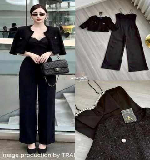 Set 2 ชิ้นสุดคุ้ม: ประกอบด้วย Jumpsuit สายเดี่ยว และเสื้อคลุมทรง Crop ผ้าทวีด
