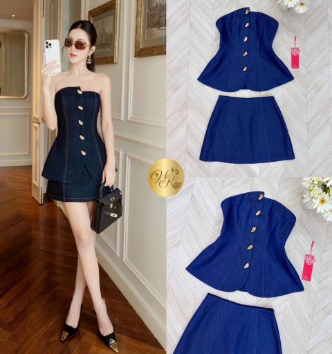 Set เสื้อเกาะอกกับกระโปรงสั้น เสื้อกระดุมทอง กระโปรงเอวสูง