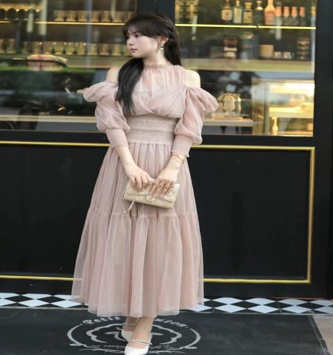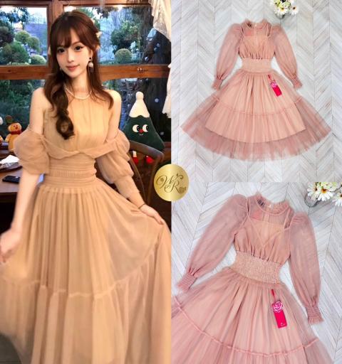 เดรสแขนยาว เว้าไหล่ ปลายแขนสม็อค เอวสม็อค ช่วงกระโปรงทรงบาน