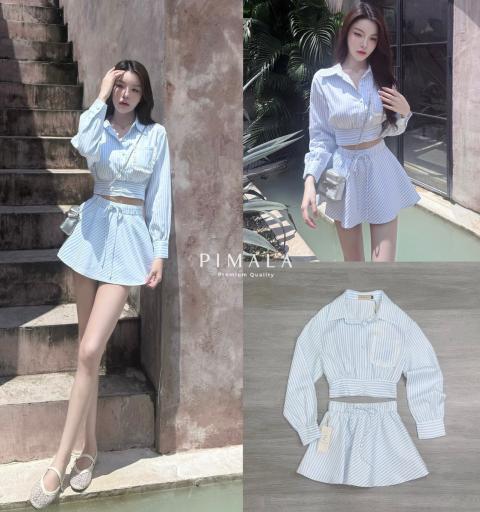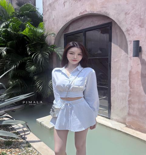 เซ็ตเสื้อเชิ้ตคอปกแขนยาวมาในแบบทรงcropทำให้หุ่นดีเอวเล็ก