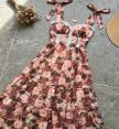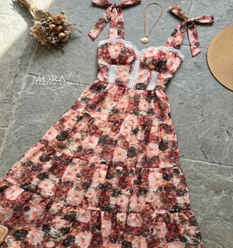 เดรสสายเดี่ยวผูกไหล่ตัวยาว แต่งดีเทลฉลุดอกไม้ทั้งตัว แต่งดีเทลฉลุลุกกไม้ด้านหน้า