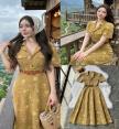 เดรสยีนส์คอปกแขนสั้นตัวยาว แต่งกระดุมด้านหน้า แต่งลายดอกทั้งชุด