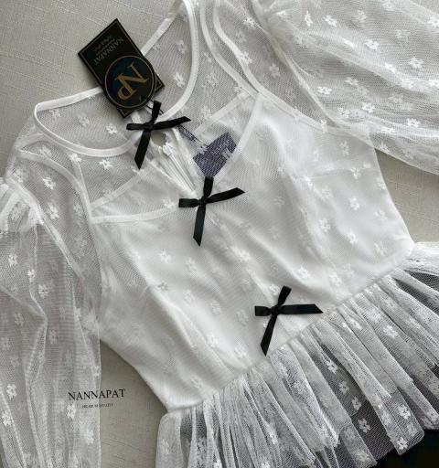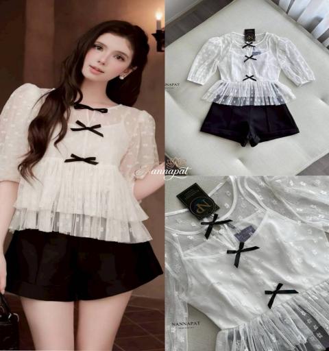 TAG :: NANNAPAT (NP)  CONCEPT :: งานต้อง Premium กำไรน้อยไม่ว่า คุณภาพ เละ เนื้อผ้าต้องดี  ♡DETAILS♡  "น่ารักจนใจเจ็บ!   ลุคคุณหนูสไตล์ Coquette โทนขาว-ดำที่หยิบมาใส่เมื่อไหร่ก็ปัง" สายหวาน สายคาเฟ่ ห้ามพลาดชุดนี้เด็ดขาดค่ะ! NANNAPAT จัดชุดเซ็ตที่ดึงความน่ารักของผู้หญิงออกมาได้แบบเกินร้อย ด้วยดีเทลที่กำลังฮิตสุดๆ ในตอนนี้ ท่อนบนเป็นเสื้อผ้าตาข่ายซีทรู (Tulle) เนื้อนิ่ม พิมพ์ลายดอกไม้จิ๋วทั่วตัว แขนพองทรงตุ๊กตานิดๆ ดูละมุน กิมมิคที่ใครเห็นก็ต้องโดนตกคือ 'โบว์กำมะหยี่สีดำ' 3 ชิ้นเรียงยาวด้านหน้า ตัดกับเสื้อสีขาวได้เด่นและน่ารักมากก! ชายเสื้อทำเป็นทรงระบาย (Peplum) ซ้อนกัน 2 ชั้น ทรงนี้บอกเลยว่าพรางพุงน้อยๆ ได้เนียนกริบ (ตัวเสื้อมีซับในสายเดี่ยวสีขาวเย็บติดมาให้เลย ไม่ต้องกลัวโป๊ค่ะ) แมทช์เข้าเซ็ตกับกางเกงขาสั้นสีดำเอวสูง ทรงกางเกงสวยมากก มีการตีเกล็ดหน้าและพับเบิ้ลปลายขา ช่วยพรางให้ต้นขาดูเล็กและช่วงขาดูเรียวยาวขึ้น ลุคนี้ใส่ไปถ่ายรูปคาเฟ่ชิคๆ ไปเดท หรือไปเที่ยววันหยุดก็รับรองว่ายอดไลก์กระจายค่ะ    COLOR 》》》  NP. STANDARD SIZE  ( Size โดยประมาณนะค่ะ) S }} Bust 32-33"/ Waist 26"/ Hip 36-37" M }} Bust 34-35"/ Waist 28"/ Hip 38-39" L }} Bust 36-37"/ Waist 30"/ Hip 40-41" XL }} Bust 38-39"/ Waist 32"/ Hip 42-43" Langth }} = Shirt 20.5" / Pants 14"  Care Dry clean only ควรซักแห้ง หรือ ซักมือ และเลี่ยงน้ำยาซักผ้า เพื่อเป็นการถนอมผ้า และ ลดความเสียหายวัสดุตกแต่ง นะคะ  ตรวจสอบสินค้าทุกครั้งก่อนออกจากร้านนะคะ จะได้ไม่เสียเวลาคะ  เปลี่ยนคืนสินค้ามีตำหนิต้องภายใน 10 วันนะคะ ป้ายไม่ตัด ห่อเดิมนะคะ  ได้รับสินค้าแล้ว ถ่ายวีดีโอตอนแกะเช็คสินค้าทุกครั้ง เผื่อมีปัญหา จะได้ใว้ยืนยันเพื่อการเปลี่ยนคืนนะคะ |