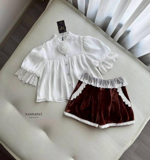 TAG :: NANNAPAT (NP)  CONCEPT :: งานต้อง Premium กำไรน้อยไม่ว่า คุณภาพ เละ เนื้อผ้าต้องดี  ♡DETAILS♡   "สวยหวานดั่งตุ๊กตาวินเทจ   เนรมิตลุคคุณหนูสายละมุน ด้วยเซ็ตแต่งดอกกุหลาบ 3D สุดเลอค่า!" วันพิเศษทั้งที ลุคต้องเป๊ะและโดดเด่นกว่าใคร! ขอแนะนำชุดเซ็ตจาก NANNAPAT รุ่นนี้ที่ผสานความหวานและความหรูหราไว้ด้วยกันแบบสิบเต็มสิบค่ะ ท่อนบนเป็นเสื้อสีขาวออฟไวท์ทรงคอตั้งระบายเบาๆ ดูผู้ดีมาก กิมมิคที่ขโมยหัวใจคือ 'ดอกกุหลาบ 3D' ขนาดใหญ่ที่คอเสื้อ(ถอดได้คะ) และกระดุมคริสตัลสุดหรู แขนเสื้อทรงตุ๊กตาพองๆ ปลายแขนตัดต่อลูกไม้ฉลุลายเพิ่มความฟรุ้งฟริ้ง แมทช์คู่มากับกางเกงขาสั้นที่ใช้เนื้อผ้า 'กำมะหยี่ (Velvet)' สีน้ำตาลเข้ม ดูแพงและมีเทกเจอร์ที่สวยเงางามยามล้อแสงไฟ ตกแต่งขอบเอวและกระเป๋าด้วยลูกไม้สีขาวเข้าเซ็ตกับตัวเสื้อแบบพอดีเป๊ะ จะใส่ไปจิบชายามบ่าย (High Tea) ดินเนอร์หรู หรือคาเฟ่สไตล์คลาสสิก ลุคนี้ก็เอาอยู่ เป็นความสวยที่มองกี่ทีก็ไม่เบื่อแน่นอนค่ะ    COLOR 》》》  NP. STANDARD SIZE  ( Size โดยประมาณนะค่ะ) S }} Bust 39"/ Waist 26"/ Hip 38" M }} Bust 41"/ Waist 28"/ Hip 40" L }} Bust 43"/ Waist 30"/ Hip 42" XL }} Bust 45"/ Waist 32"/ Hip 44" Langth }} = Shirt 18.5" / Pants 13.5"  Care Dry clean only ควรซักแห้ง หรือ ซักมือ และเลี่ยงน้ำยาซักผ้า เพื่อเป็นการถนอมผ้า และ ลดความเสียหายวัสดุตกแต่ง นะคะ  ตรวจสอบสินค้าทุกครั้งก่อนออกจากร้านนะคะ จะได้ไม่เสียเวลาคะ  เปลี่ยนคืนสินค้ามีตำหนิต้องภายใน 10 วันนะคะ ป้ายไม่ตัด ห่อเดิมนะคะ  ได้รับสินค้าแล้ว ถ่ายวีดีโอตอนแกะเช็คสินค้าทุกครั้ง เผื่อมีปัญหา จะได้ใว้ยืนยันเพื่อการเปลี่ยนคืนนะคะ |
