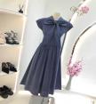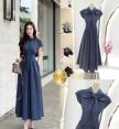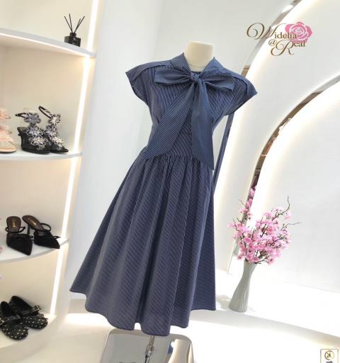 เดรสแขนกุดตัวยาวสวยชช่องคอผูกโบเก๋ ตัวชุดมาในผ้าเนื้อสวยลายริ้ว