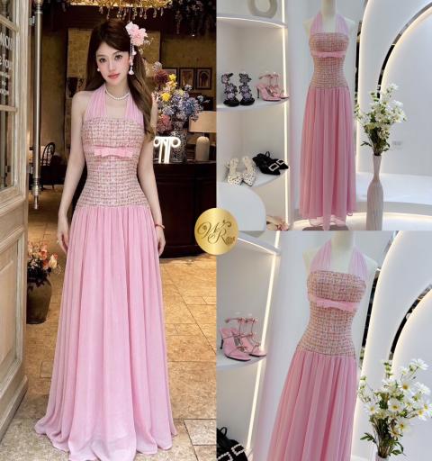 Widelia    เดรสตัวยาว สายคล้องคอ ผูกโบว์หลัง อกเย็บโบว์ ช่วงบนเนื้อผ้าทวิต  [พร้อมส่ง]