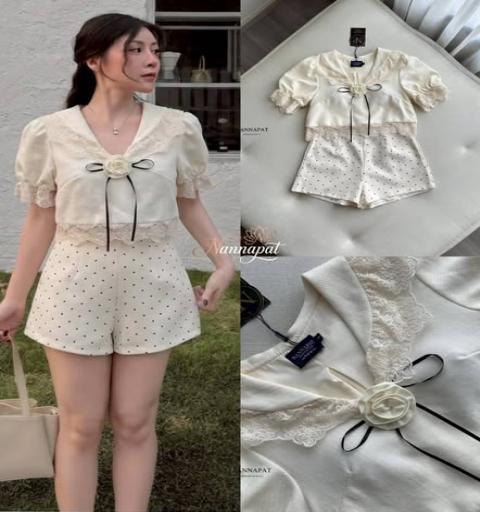เซ็ตเสื้อแต่งลูกไม้แมทช์ขาสั้นลายจุด ดีเทลใจละลายมาก"