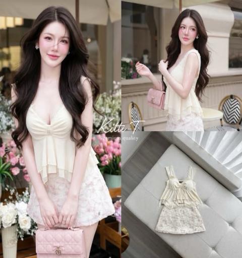 : SET (2)ชิ้น เสื้อตกแต่งด้วยดีไซน์ทันสมัย บริเวณขอบสายและหน้าอกตกแต่งผ้าฉลุ