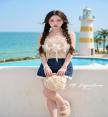 Set เสื้อถักแขนกุดตัวสั้น แต่งขอบลูกไม้ แต่งโบว์และดอกไม้D ช่วงอก ทรงoversize เล็กน้อย