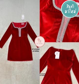 เดรสยาวประมาณเข่าดีเทลด้านบนกำมะหยี่แดงคอตัดสี่เหลี่ยมแต่งโบคาดสายแต่งเข็มกลัดโบ  [พร้อมส่ง]