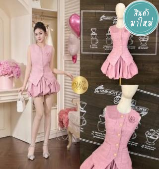 Set เซ็ตเสื้อแขนกุด+กระโปรงสั้นทรงบอลลูน อกมีเข็มกลัดดอกไม้  [พร้อมส่ง]