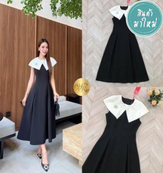 Dress เดรสตัวยาว ปกคอสีขาว มีเข็มกัดเพชรให้ 1 อัน เนื้อผ้าเรียบ  [พร้อมส่ง]