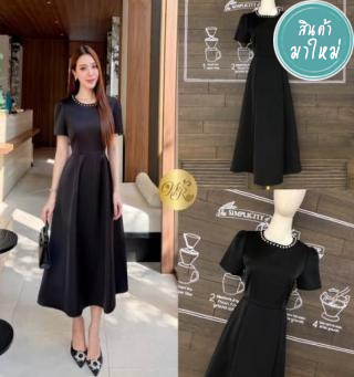Dress เดรสตัวยาว แขนสั้น คอกลมเย็บไข่มุก ซิปหลัง เนื้อผ้าเรียบ สีพื้น  [พร้อมส่ง]