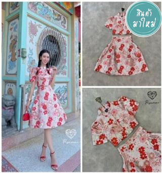เซ็ตเสื้อกี่เพ้างานผ้าทอนูนสีชมพูดอกแดงมาคู่กับกระโปรง 5 ส่วน  [พร้อมส่ง]