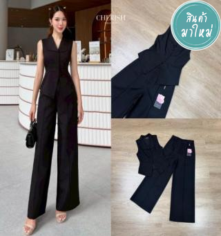 ชุดเซ็ท สุดเรียบหรูดูโก้ สวยแบบไม่ซ้ำใคร ตัวเสื้อคอปกแขนกุดตัวยาวดีไซน์เก๋