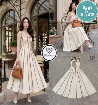 เดรสแขนกุดตัวยาวสีครีมทรงบานแต่งลายเส้นสีน้ำตาลนูน