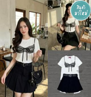 เซต 3 ชิ้น ขาว+ดำ เสื้อคอกลมสีขาวแขนสั้นทรงตรงพิมพ์ลายเสื้อในสีดำผูกโบว์